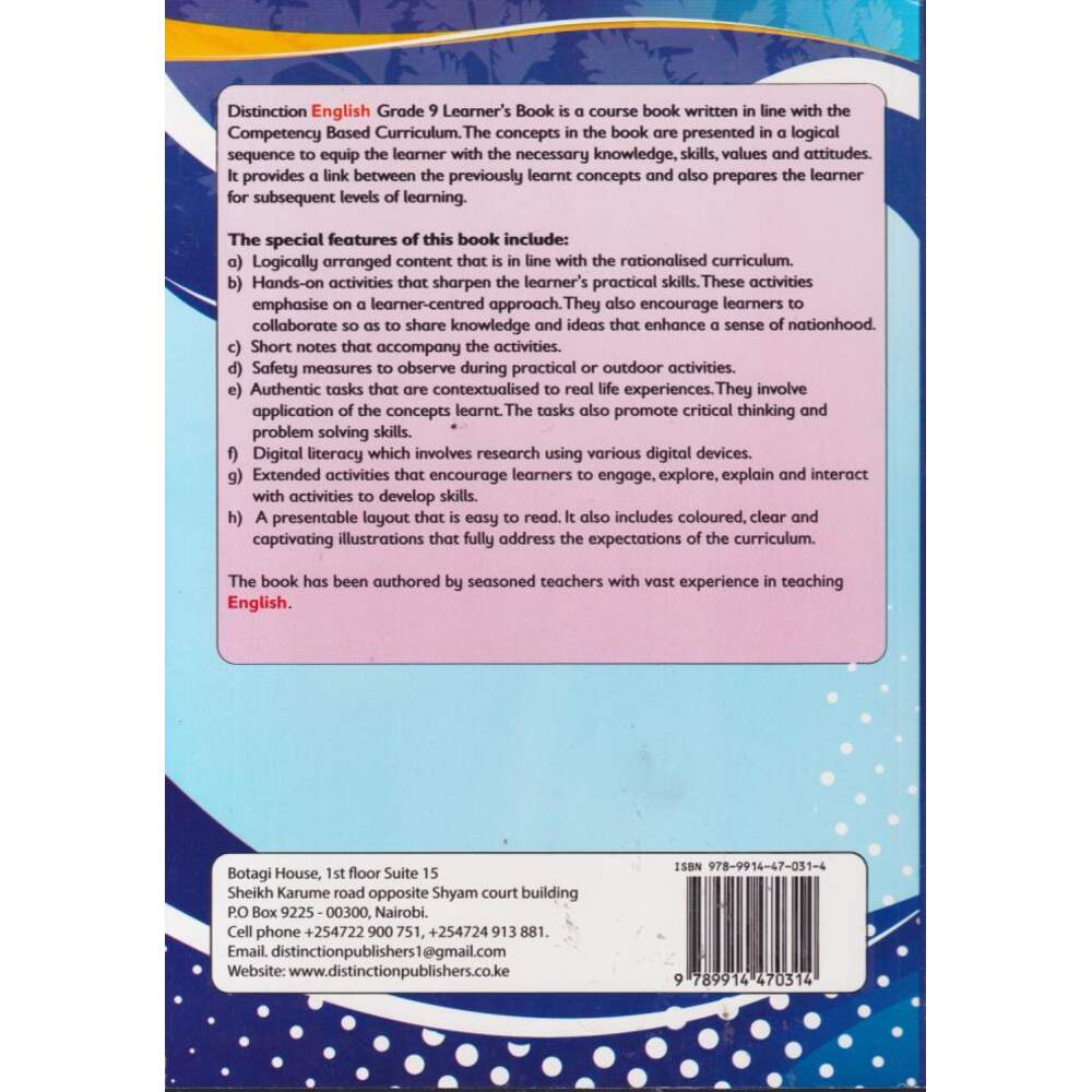 Distinction English Grade 9 is a CBC-aligned coursebook designed to enhance learners’ communication skills, language proficiency, and literary appreciation. It covers reading, writing, listening, speaking, grammar, and vocabulary development, providing a strong foundation for effective communication.