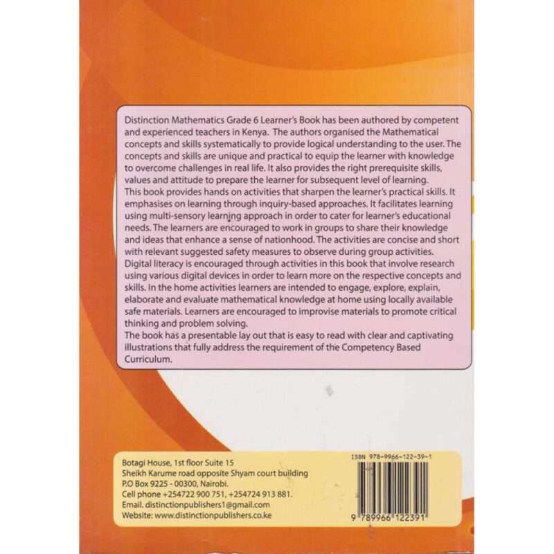 Distinction Mathematics Grade 6 is a well-structured course book developed in line with the Competency-Based Curriculum (CBC). It offers comprehensive coverage of all strands through engaging activities, clear explanations, and varied assessments. The book promotes critical thinking, problem-solving, and independent learning, making it an ideal resource for learners, teachers, and parents.