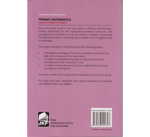This is the fourth book in the new series of Primary Mathematics written specifically for the competence-based curriculum.Thecoursebook is intended for use by Grade 4 learners. It prepares the learner for day to day living and number work in higher levels of schooling.