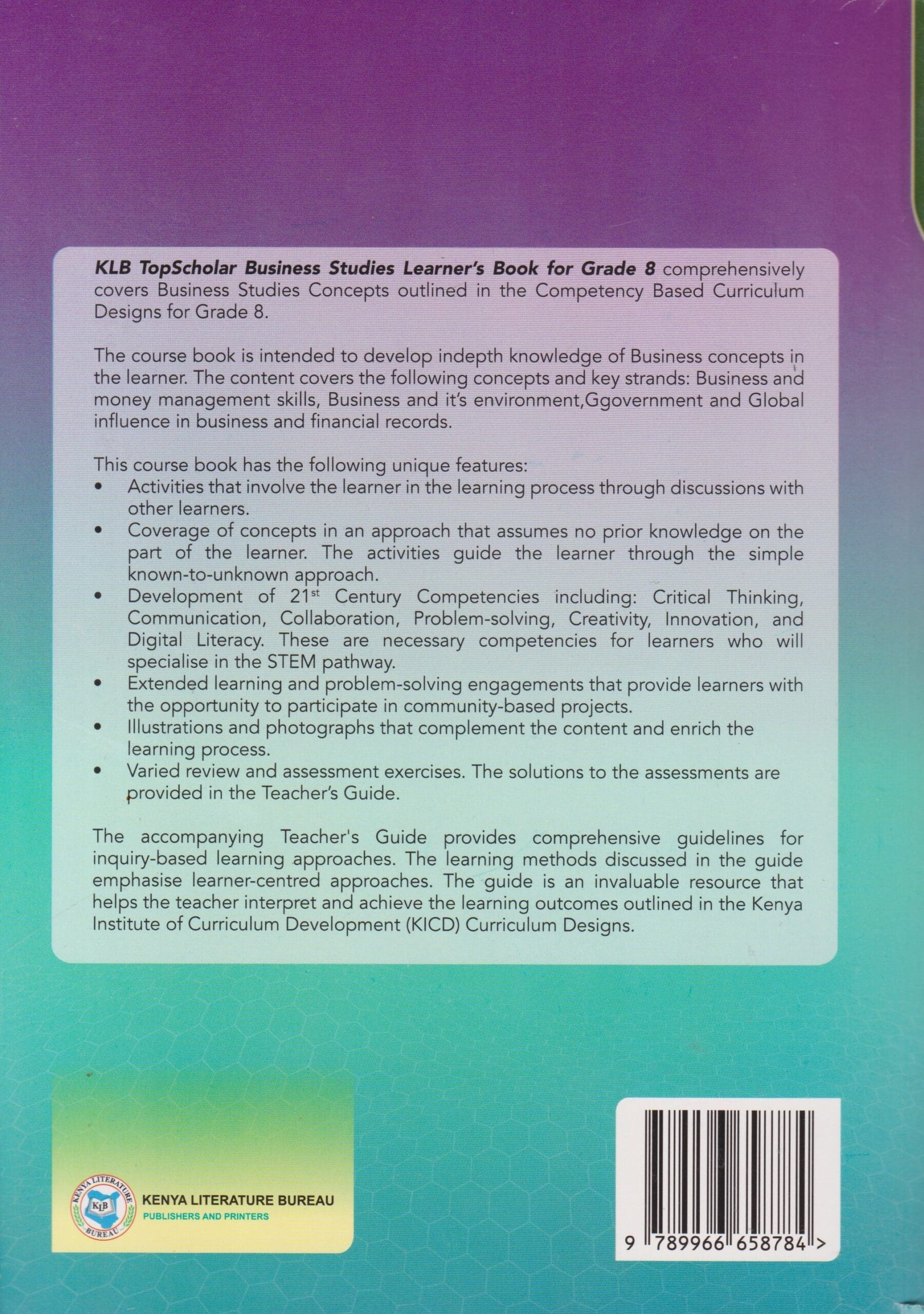 KLB TopScholar Business Studies Learner’s Book for Grade 8 comprehensively covers Business Studies Concepts outlined in the Competency Based Curriculum Designs for Grade 8.