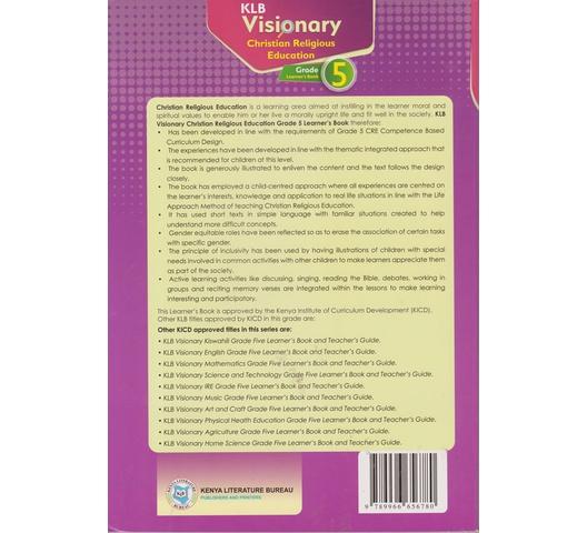 Christian Religious Education is a learning area aimed at instilling in the learner moral and spiritual values to enable him or her live a morally upright life and fit well in society. KLB Visionary Christian Religious Education Grade 5 Learner’s Book, therefore: