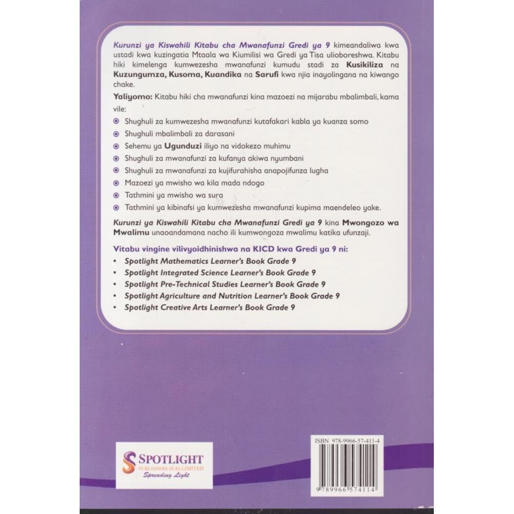Kurunzi ya Kiswahili Grade 9 (Spotlight) is a CBC-aligned coursebook designed to strengthen learners’ Kiswahili language skills and literary appreciation. It covers strands such as kusoma, kuandika, kusikiliza, kuzungumza, and lugha, with a strong emphasis on comprehension, grammar, and creative expression.