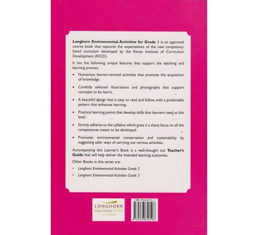 Longhorn Environmental Activities for Grade I is an approved course book that captures the expectations of the new competency-based curriculum developed by the Kenya Institute of Curriculum Development (KICD). It has the following unique features that support the teaching and learning process: