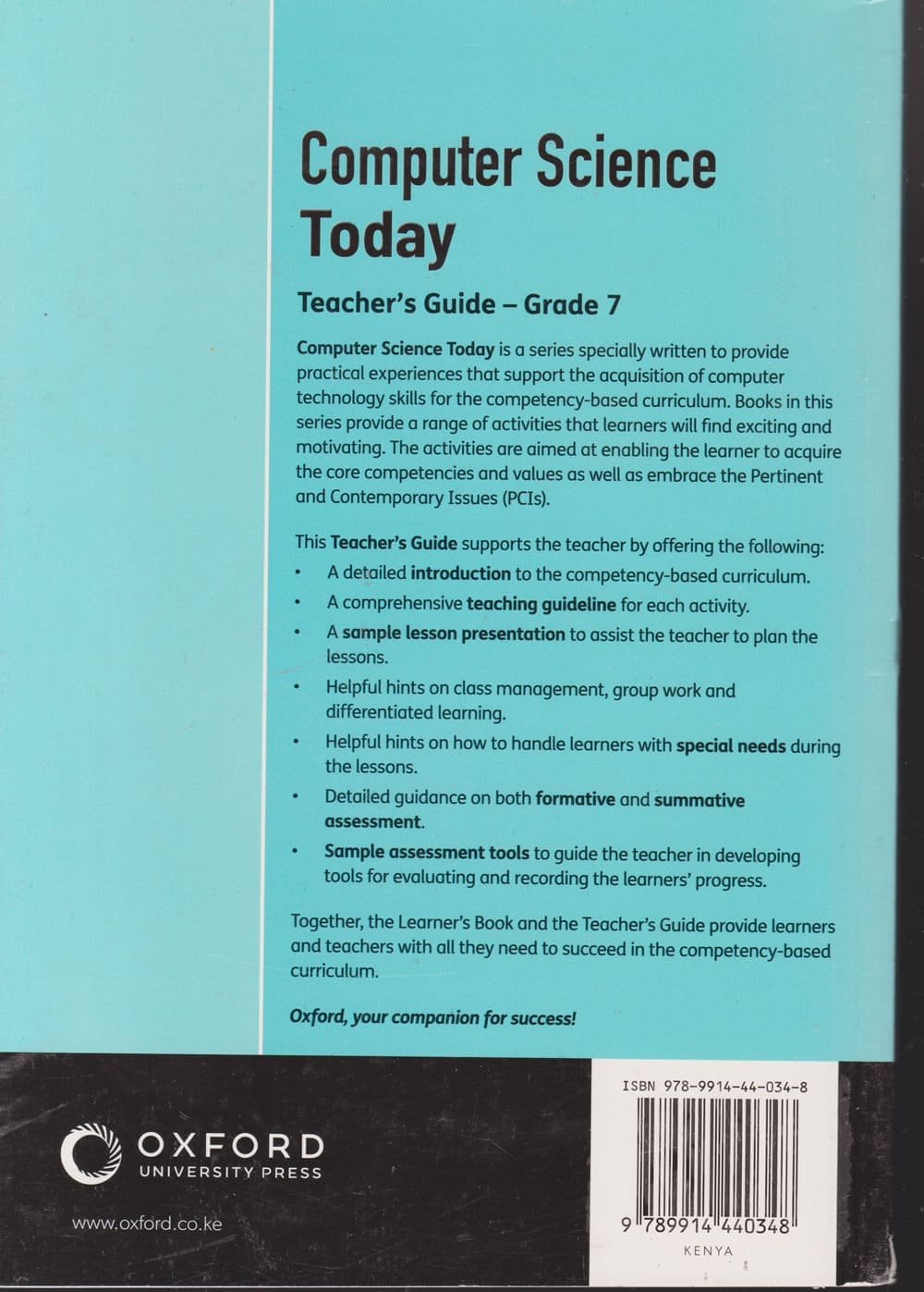 OUP TRS Guide Computer Science Today Grade 7 is a teacher’s resource book developed to support the effective delivery of the CBC Computer Science curriculum. It provides clear lesson plans, step-by-step teaching approaches, and practical strategies to help teachers explain digital concepts with ease.