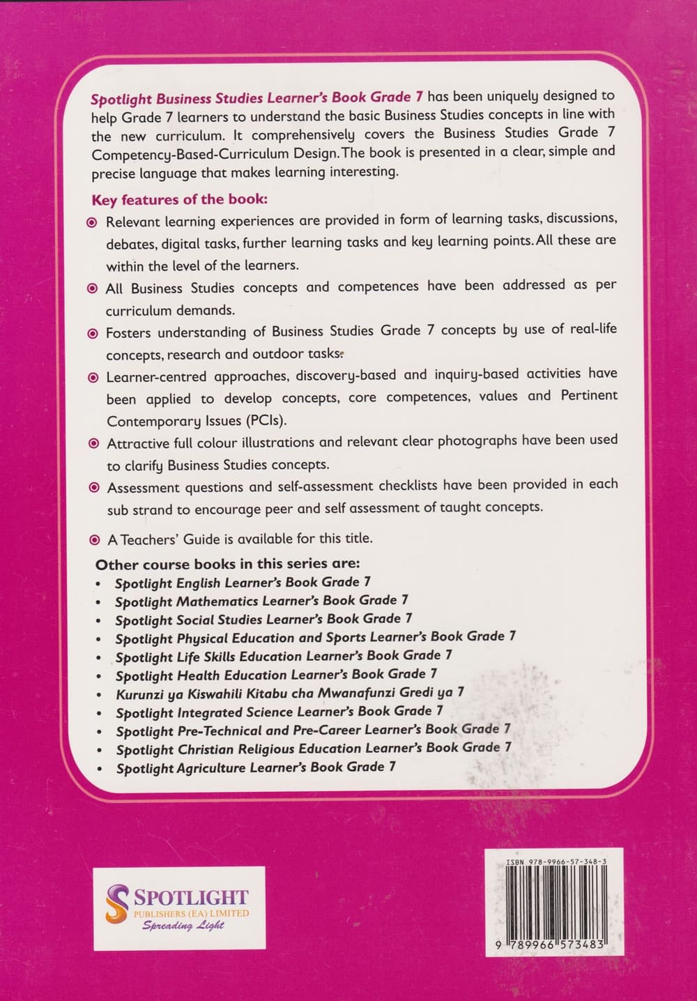 Spotlight Business Studies Grade 7 is a CBC-aligned coursebook that introduces learners to essential business concepts and practical skills. It covers key areas such as Entrepreneurship, Trade, Financial Literacy, and Consumer Education, helping learners understand and apply business principles in real-life situations.