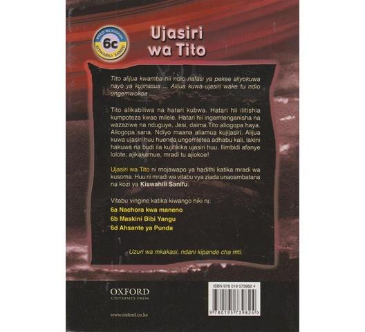 Tito alijua kwamba hii ndio nafasi ya pekee aliyokuwa nayo ya kujinasua Alijua kuwa ujasiri wake tu ndio ungemwokoa Tito alikabiliwa na hatari kubwa. Hatari hii ilitishia kumpoteza kwao milele. Hatari hii ingemtenganisha na wazaziwe na nduguye, Jesi, daima.Tito aliogopa haya. Aliogopa sana. Ndiyo maana aliamua kujijasiri. Alijua kuwa ujasiri huu huenda ungemletea adhabu kali, lakini hakuwa na budi ila kujitwika ujasiri huu. Ilimbidi afanye lolote, ajikakamue, mradi tu ajiokoe! Ujasiri wa Tito ni mojawapo ya hadithi katika mradi wa kusoma. Huu ni mradi wa vitabu vya ziada unaoambatana na kozi ya Kiswahili Sanifu.